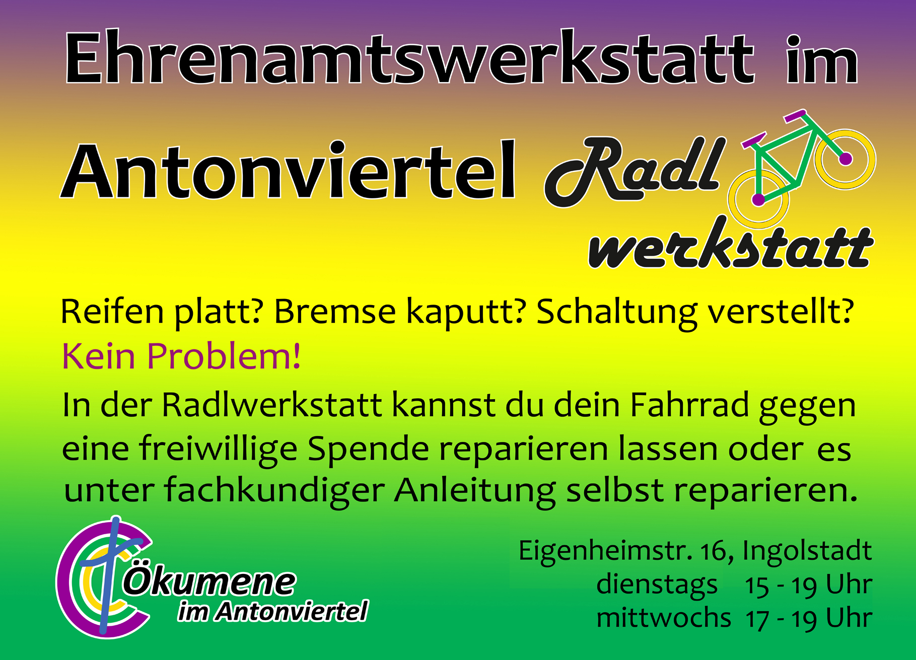 Die Ehrenamtswerkstatt versteht sich als Nachbarschaftshilfe im Südwesten von Ingolstadt. Bei diesem ökumenischen Projekt reparieren ehrenamtliche Mitarbeiter gegen eine freiwillige Spende Fahrräder oder leisten fachkundige Hilfe zur Selbsthilfe. Aktuell ist die Radlwerkstatt von März bis November jeden Dienstag von 15 – 19 Uhr und jeden Mittwoch von 17 - 19 Uhr geöffnet. |